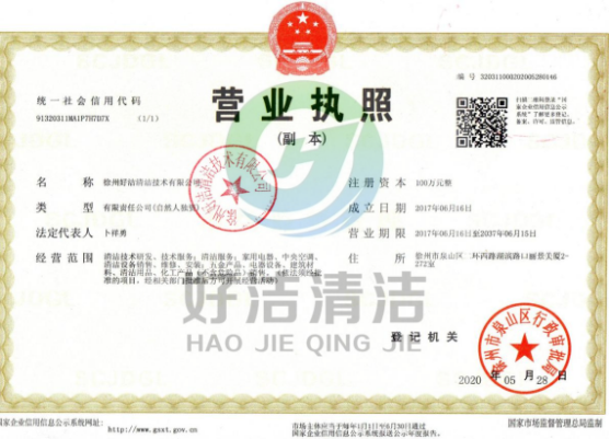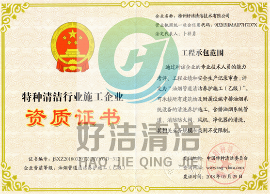 徐州好潔清潔技術(shù)有限公司是根據(jù)國(guó)家消防部門(mén)的工作需求的需要,報(bào)請(qǐng)工商行政批準(zhǔn)的專(zhuān)業(yè)清洗油煙管道的單位,是一家擁有合法經(jīng)營(yíng)執(zhí)照的正規(guī)企業(yè)。專(zhuān)業(yè)從事油煙管道清洗、大型油煙機(jī)清洗、中央空調(diào)清洗、家用電器清洗的清潔技術(shù)公司,服務(wù)客戶(hù)包括各大飯店、酒店、醫(yī)院、學(xué)校、寫(xiě)字樓、大廈、商場(chǎng)、公寓、單位、辦公樓、機(jī)關(guān)單位、工廠(chǎng)及普通家庭。我公司擁有嚴(yán)格的管理制度、先進(jìn)的設(shè)備、精湛的技術(shù),將人性化的服務(wù)模式及專(zhuān)業(yè)的清洗技術(shù)融為一體,清洗維修技師都具備多年清洗、維修、 安裝經(jīng)驗(yàn),并不斷吸收新的技術(shù)和先進(jìn)的檢測(cè)設(shè)備來(lái)滿(mǎn)足廣大客戶(hù)的需求......